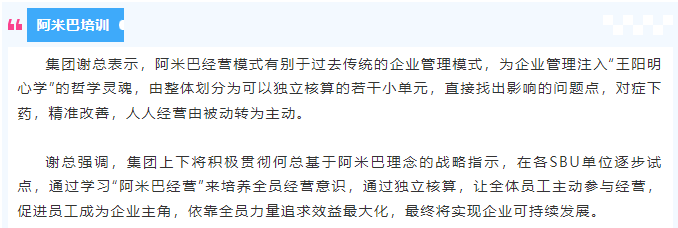 集團何總表示,阿米巴經營成功的關鍵在于通過這種經營模式明確企業發展方向,并把它傳遞給每位員工。每位員工必須深刻理解阿米巴經營模式,包括組織構造、運行方式及其背后的思維方式,系統地學習中國式阿米巴經營模式,優化企業經營管理,努力提升企業經營能力。